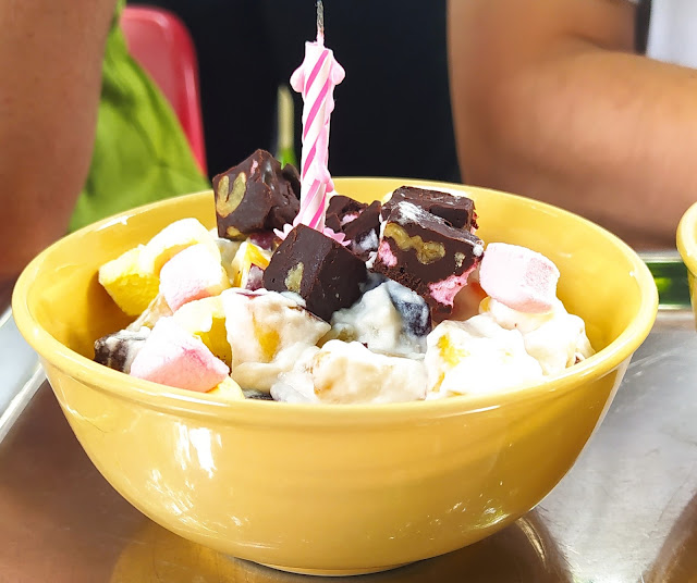Qui, ovviamente, scelgo la ricetta più semplice per il bonbon locale ma, come dessert in un pranzo di famiglia che celebra compleanni, decido per un mix con il resto della tradizione americana ed abbino alle barrette di cioccolato la macedonia. Che, ovviamente, alleggerisco: uso frutta fresca invece di ananas sciroppato e ciliegie al Maraschino, e utilizzo yogurt al posto del terrificante Cool Whip!